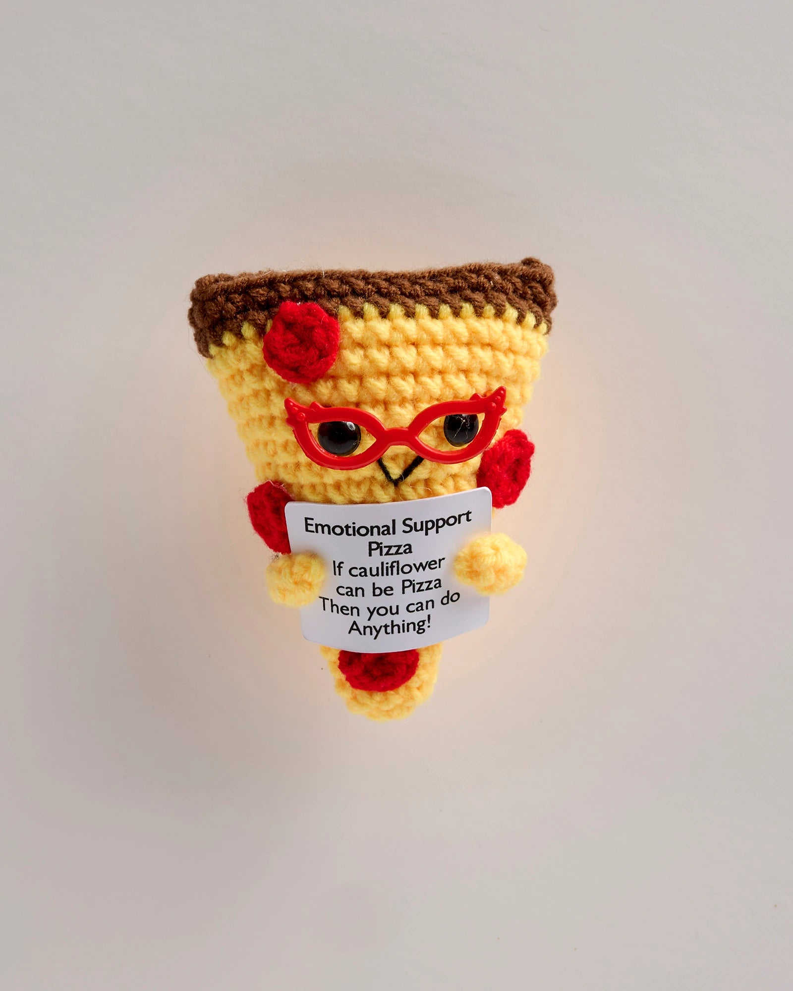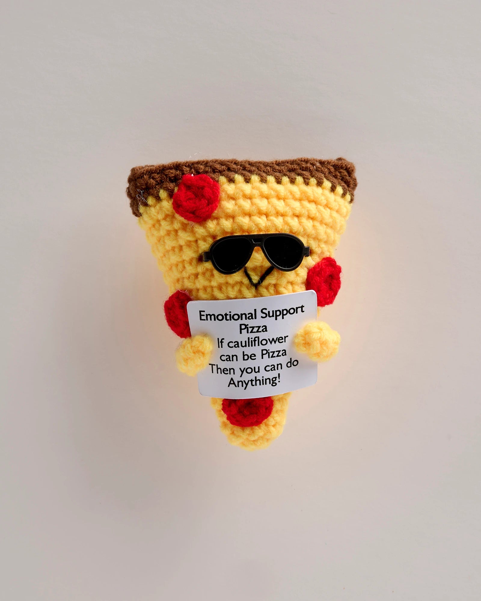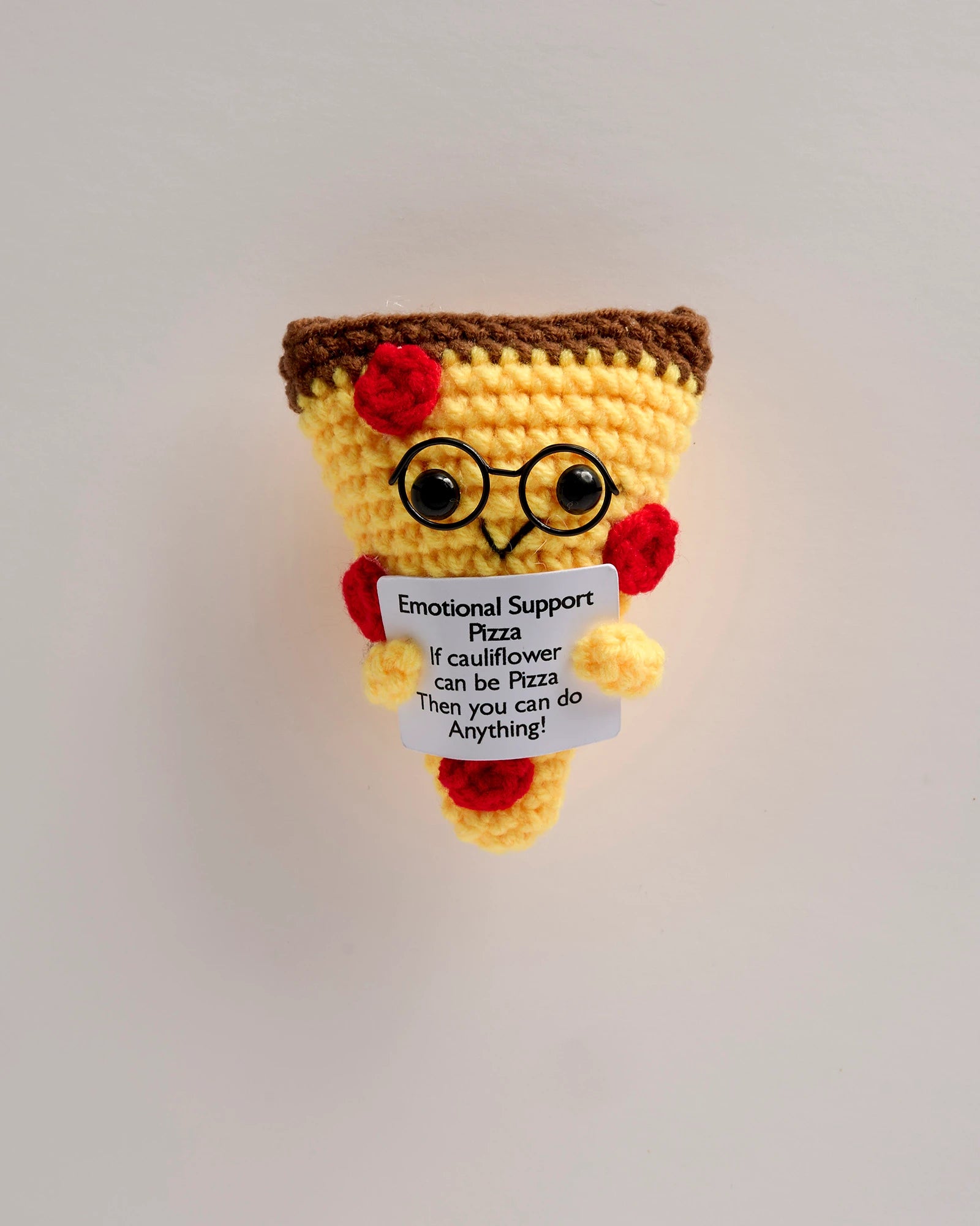 Bring comfort and confidence with this uplifting crochet Emotional Support Pizza featuring a playful message that reminds someone they can do anything — even on a cauliflower crust. Designed to blend humor with encouragement, this pizza gift is perfect for gluten-free foodies, health-conscious friends, coworkers, students, birthdays, and care packages. Whether they’re chasing big goals or just surviving the week, this encouragement gift delivers support without the carbs.
